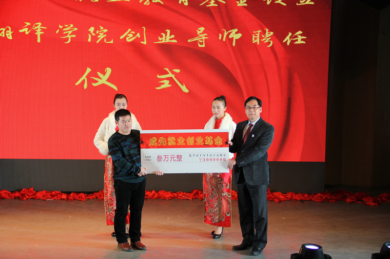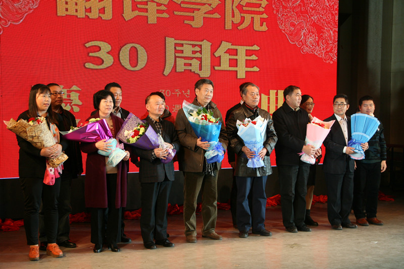 一段社会各界人士为翻译学院送祝福的视频集锦拉开了本次晚会的序幕。晚会伊始,1985级校友和在校生用诗朗诵的形式为大家带来了一场跨越三十载的对白,悠悠《犁牛之子》荡漾在舞台中央,也荡漾在每个翻译学子的心中;诗朗诵结束后,2015级同学为1985级师哥师姐们佩戴校徽,继而校友代表们为教师代表献上鲜花。三十年来,翻译学院为社会培养了大批外语人才。2004级校友张成先从上海专程赶来参加院庆活动,院长卢卫中对张成先董事长为学院捐赠创业教育基金表示感谢,并为他颁发亚搏集团官网(中国)官方网站翻译学院创业导师聘书。