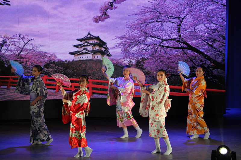 随后,充满古典韵味的古筝演奏令观众陶醉不已,欢快热烈的舞蹈《盛世欢歌》带起了全场的气氛,钢琴与小提琴的天籁合作引人入胜,历届外文歌曲大赛优秀选手的外文歌联唱展现了翻译学子的青春活力,师生合作的朝鲜族舞蹈《桔梗谣》、日本舞和拉丁舞表演充满了异域风情,外籍教师和国内老师分别献上的歌唱表演则获得观众席阵阵掌声。除了歌舞表演,还有搞笑幽默的日文话剧《还珠格格》,精彩纷呈、还原度极高的《海绵宝宝》配音表演。晚会在大家共同演唱的《Good time》中落下帷幕。