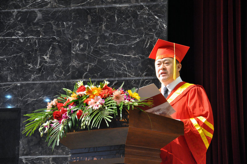 校长戚万学在典礼上讲话,代表学校向顺利完成学业的毕业生表示热烈祝贺,向为同学们的成长付出辛勤劳动的全体教职员工表示诚挚敬意,向始终关心、帮助同学们成长的家长及社会各界朋友表示衷心感谢。戚万学肯定了本届毕业生在校期间取得的优异成绩,勉励同学们永远记住我是谁,记住我们的存在是为了谁,得意时不忘形,失意时不变形,面对诱惑要坚守,选择之后能坚持。戚万学真诚祝愿2015届毕业生把过去的时光化成终生受用的财富,书写人生新的华美篇章。