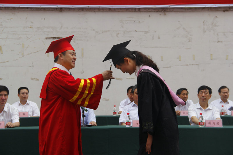 在优美的乐曲声中,校长戚万学为2015届毕业生代表颁发毕业证书、学位证书,拨正流苏。
