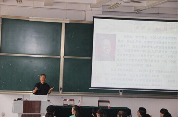 6月3日下午,中国人民大学伦理学与道德建设研究中心副主任、博士生导师肖群忠教授作了题为“道德智慧与人生幸福”的学术报告主要探讨了智德与人生幸福的相关内容以及在当代生活中大学生应如何增强道德智慧等问题。肖教授就当前大学生交往中存在的问题着重为同学们讲解了智商、情商与德商的关系,指出大学生不应只注重智商的发展,而应看到德商对于人的发展具有重要价值。