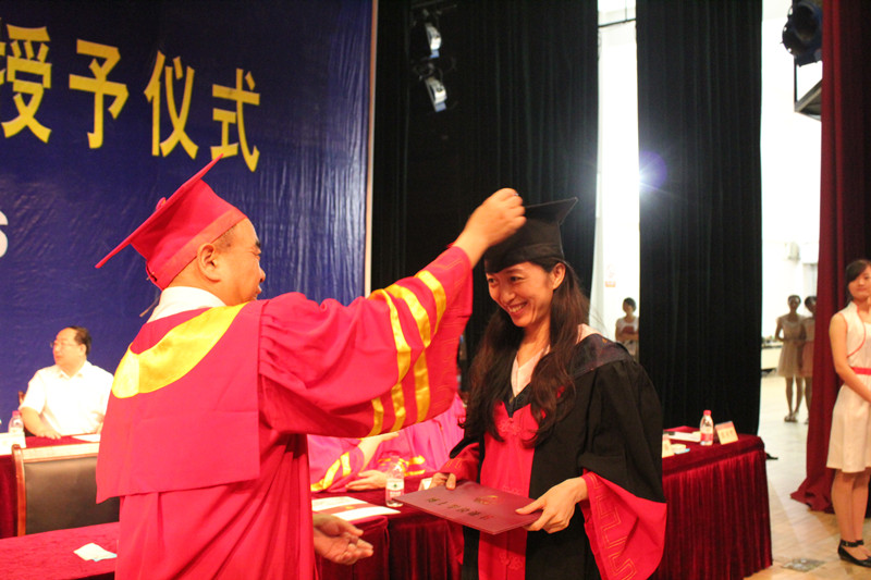 在欢乐的乐曲声中, 20位博士学位获得者、1126位全日制硕士学位获得者走上主席台,校长傅永聚逐一为他们颁发学位证书,并拨苏正冠,合影留念。