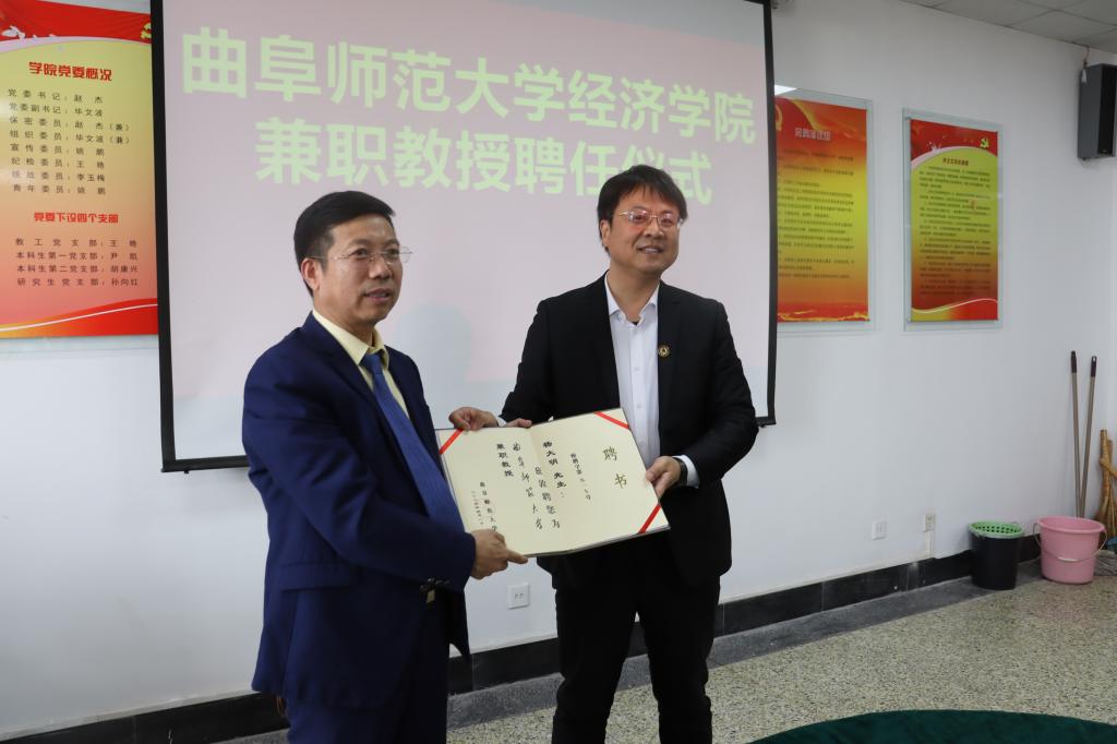 曲阜师大经济学院讯  5月7日下午,亚搏集团官网(中国)官方网站经济学院举行兼职教授聘任仪式,学校党委副书记李志红出席仪式,党委常委、副校长刘刚为商道企业集团董事长杨大明颁发兼职教授聘书。