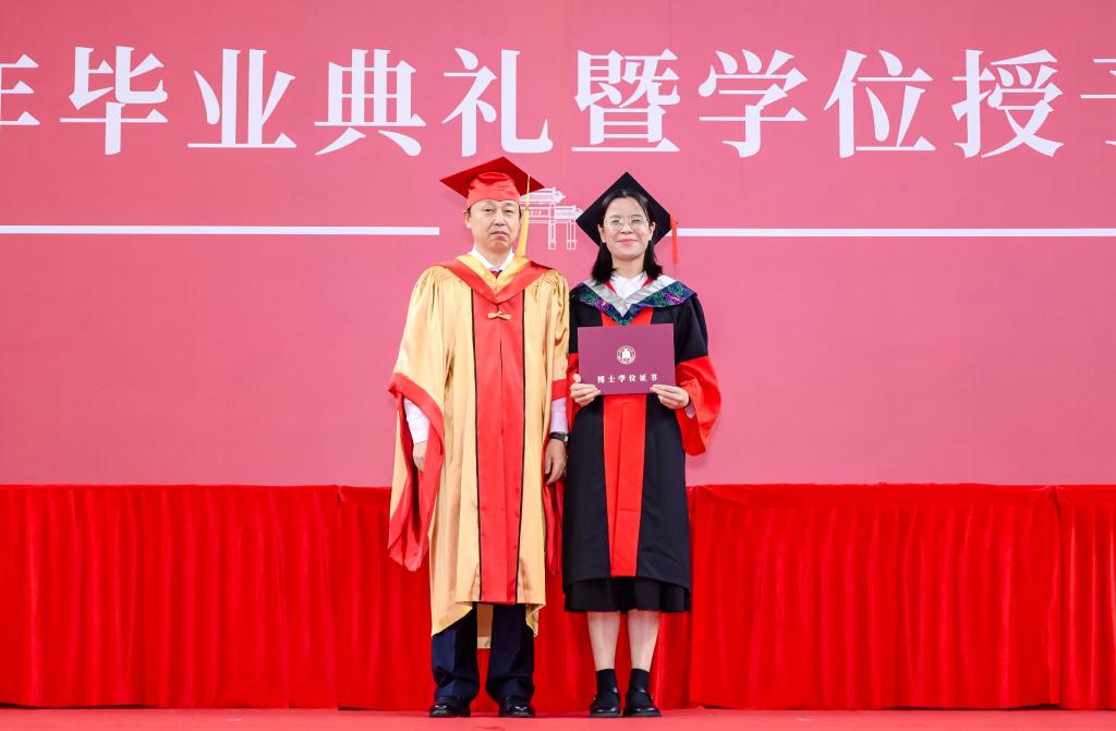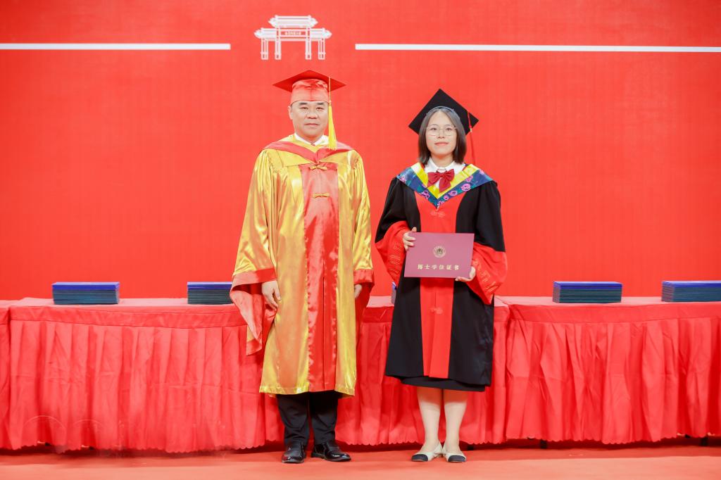 党委副书记、校长张洪海为获得博士学位的同学拨穗正冠、颁授学位证书