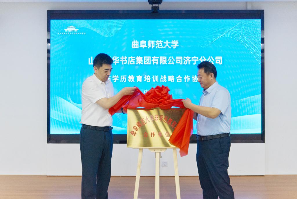 纪洪涛、张超共同为“亚搏集团官网(中国)官方网站非学历教育培训合作单位”揭牌。国内合作处处长孔宪福与山东新华书店集团有限公司曲阜分公司党总支书记、经理董军签署了非学历教育合作协议。