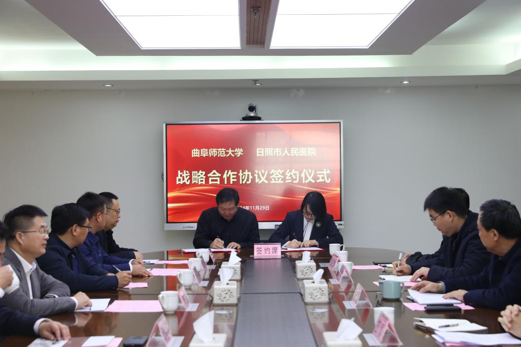 曲阜师大国内合作处处长孔宪福与日照市人民医院党委委员、副院长王慧代表双方签署了战略合作框架协议。