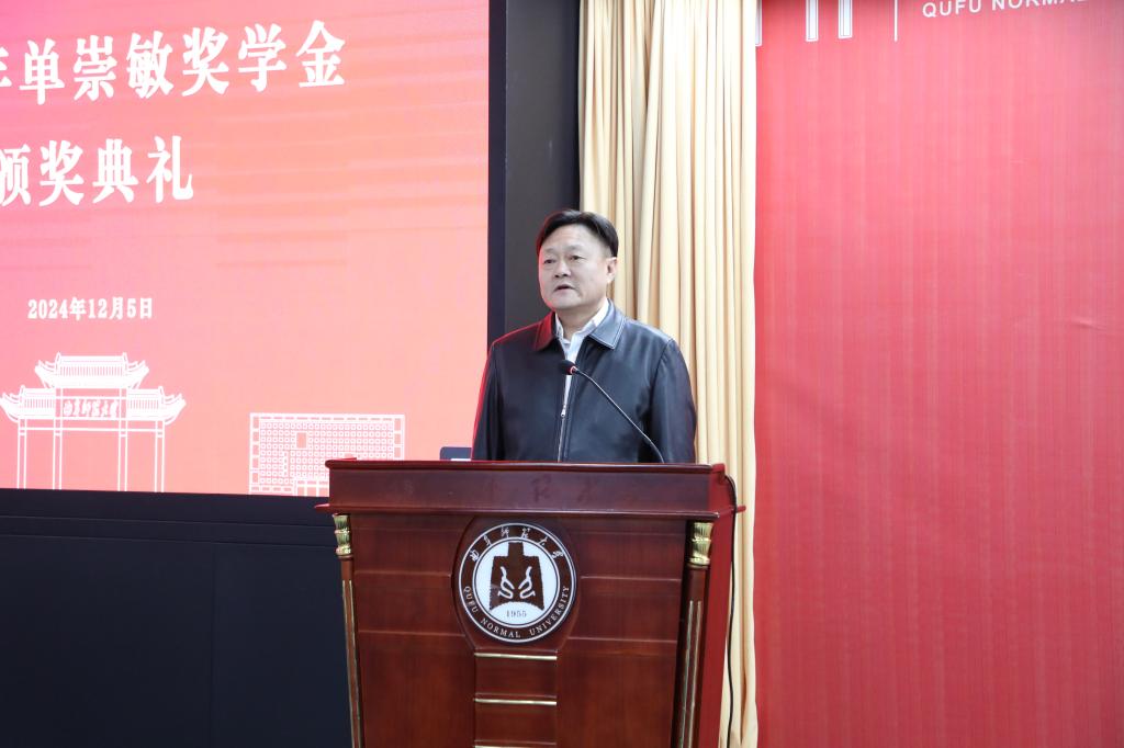 曲阜师大国内合作处讯 12月5日,亚搏集团官网(中国)官方网站举行“单崇敏奖学金”颁奖典礼暨弘扬教育家精神报告会。宝威教育科技(山东)集团有限公司董事长单崇敏、总裁单志勇、幼教事业部总经理于莉,亚搏集团官网(中国)官方网站党委常委、副校长、孔子教育基金会理事长纪洪涛出席仪式。