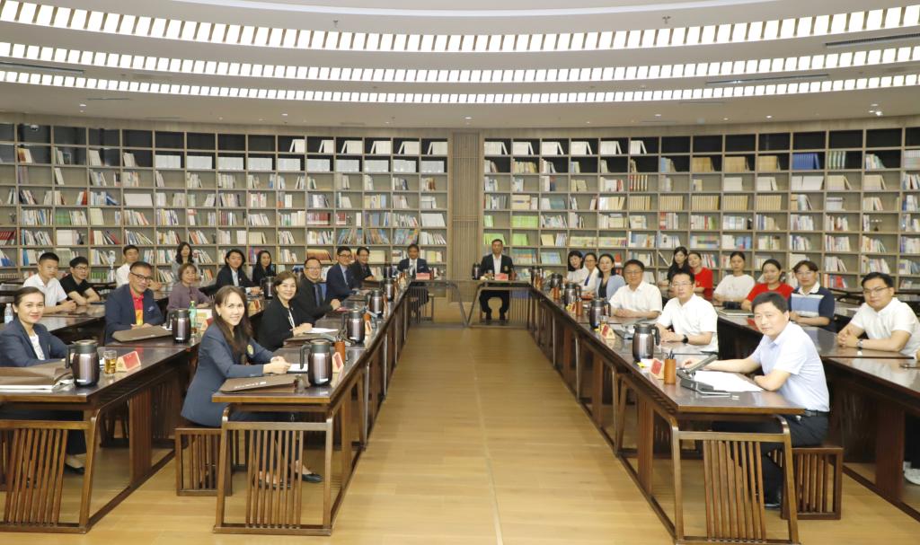 教师博物馆讯 5月28日,第三期“中外教师杏坛会讲”在教育部师德师风建设基地(教师博物馆)举办。泰国兰帕潘尼皇家大学行政副校长Sinat Koslanant一行出席,亚搏集团官网(中国)官方网站党委常委、副校长胡凡刚致辞,党委常委、宣传部部长、教师博物馆馆长孙祥广作会讲总结。