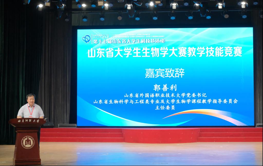 郭善利代表山东省生物科学与工程类专业及大学生物学课程教学指导委员会致辞。他高度肯定了本次赛事的筹备工作,对指导教师、专家评委以及生命科学学院师生的辛勤付出表示敬意。他指出大赛的举办为参赛者提供了展示才华的平台,促进了高校间的交流与合作,为山东省生物学优秀师范生的培养注入了新活力。