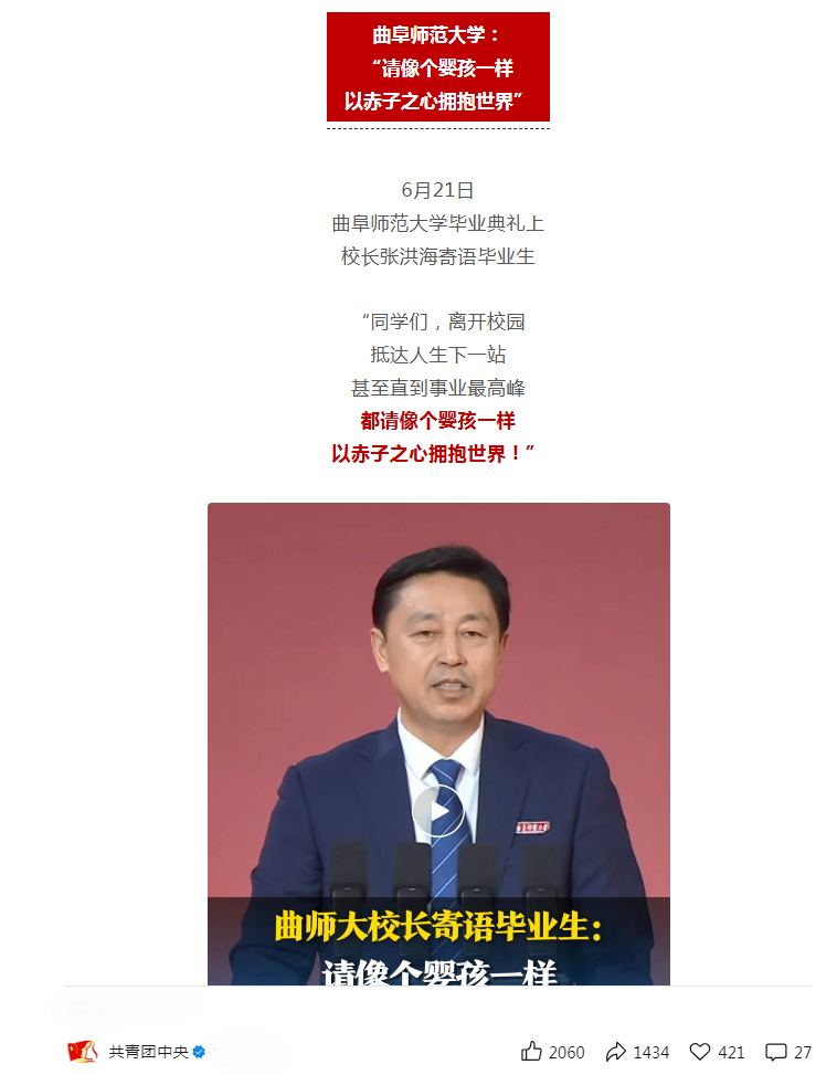 党委宣传部讯 “在毕业寄语中总有一些话细腻、温暖还蕴含着关于成长的智慧与哲思”,6月27日,共青团中央官方微信聚焦各大高校2025年毕业典礼上那些照亮青春的璀璨金句,遴选分享了来自亚搏集团官网(中国)官方网站与西华大学、中国传媒大学、华东师范大学、复旦大学等5所高校的师长毕业寄语,以“10万+”的阅读量刷屏朋友圈。