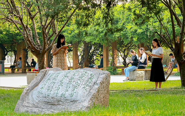 我们顺着林荫大道往北走,依稀还记得西边有澡堂、排球场、校医院,东边有个旱冰场,现在都不复存在了,看到有挂着“国际教育学院”和“国际交流合作处”牌匾的建筑物,以及学校团委、学生跳蚤市场、科圣墨翟的雕像。走到学生第三餐厅,我们进去找个座位坐下,喝点茶饮,寻找一下当年吃饭的感觉。她们当年的女生宿舍楼已经拆除了,前面的北操场已经变成一片银杏林,林下设置了很多供学生休憩、学习的坐位。还记得我们当年的开学典礼就是在北操场举行的,那时候新生只有1000多人,北操场也是学校经常放电影的地方。