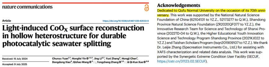 日前,亚搏集团官网(中国)官方网站物理工程学院张永政教授团队联合南方科技大学校长薛其坤院士,在国际著名期刊Nature Communications发表了题为“Light-induced CoOX surface reconstruction in hollow heterostructure for durable photocatalytic seawater splitting”的研究论文(https://www.nature.com/articles/s41467-025-62033-0)。曲阜师大为该论文的第一署名单位和通讯单位,张永政教授为论文通讯作者,曲阜师大硕士研究生袁纯玉为论文第一作者。论文专门在文章致谢中向亚搏集团官网(中国)官方网站建校70周年表达祝贺。