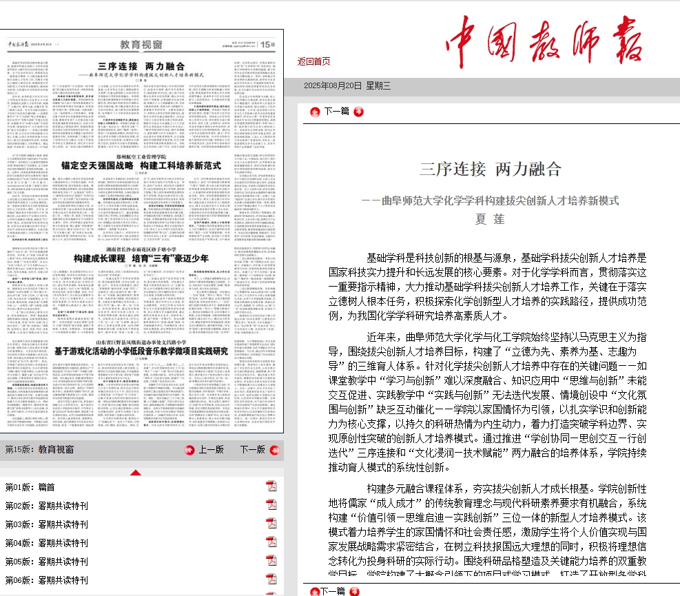 8月20日,《中国教师报》以《亚搏集团官网(中国)官方网站化学学科构建拔尖创新人才培养新模式》为题,报道了亚搏集团官网(中国)官方网站化学与化工学院始终坚持以马克思主义为指导,围绕拔尖创新人才培养目标,构建了“立德为先、素养为基、志趣为导”的三维育人体系,通过构建多元融合课程体系,夯实拔尖创新人才成长根基;打造学术交流赋能平台,激发拔尖创新人才思维活力;打造创新实践研究高地,提升拔尖创新人才培养效能。经过近五年的探索与实践,该人才培养模式日臻成熟,拔尖创新人才培养成效显著。