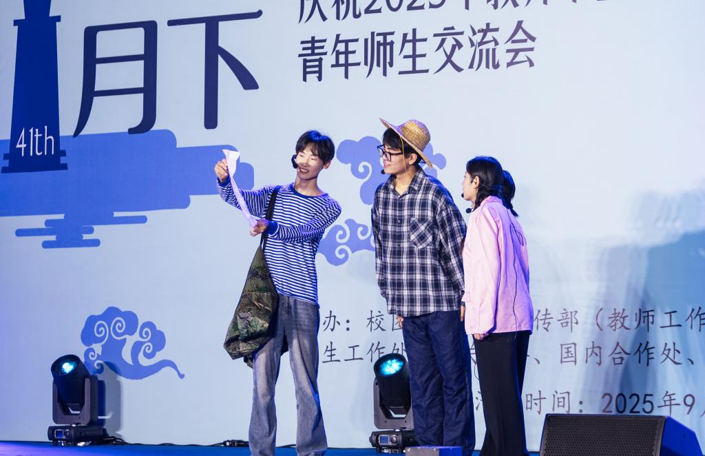 活动分为“杏坛师生夜话”和“星光草坪欢聚”两个篇章。在第一篇章,师德微话剧《两只口袋》、舞蹈《蘭叙》、歌曲《最美的太阳》《海芋恋》等节目精彩纷呈;师生演绎的微话剧《春风化雨的回响》以多维度叙事展现教育精神的传承:徐振贵老师以“学而不厌,诲人不倦”的亲身实践激励学子终身向学;辅导员李宴美通过陪伴学生成长的案例,讲述“彼此照亮、共同成就”的育人理念;高睿霞老师以“选择与热爱”为主题,分享受家庭影响坚定从教、在曲园实现理想的心路历程;校友薛建国重温求学岁月,诠释“于平凡中创造不凡”的曲园精神;研究生支教团成员王葆嘉和新生代表张艺帆分别汇报了支教经历与入学感悟,倡议发扬“犁牛之子”精神,积极投身教育事业。