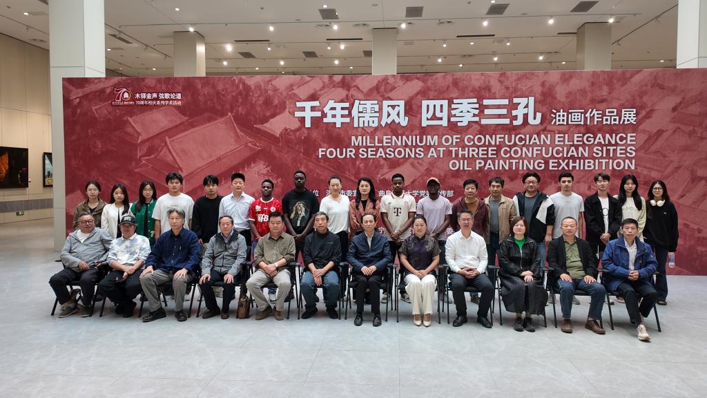 此次展出作品以“孔庙、孔府、孔林”为核心主题,艺术家们用独特视角捕捉四季景致:春之生机染檐角、夏之苍翠映朱门、秋之静美覆古柏、冬之肃穆裹碑亭。细腻笔触与丰富色彩间,孔庙的庄严、孔府的深邃、孔林的静谧跃然画布,让观者仿佛穿越时空,沉浸式感受儒家文化的博大精深。艺术家分享创作时的感悟,与观展嘉宾和来自坦桑尼亚、塔吉克斯坦等国的留学生交流互动,围绕“儒家文化如何通过艺术进行国际化传播”等展开深度对话,思想碰撞间迸发文化传承新灵感。
