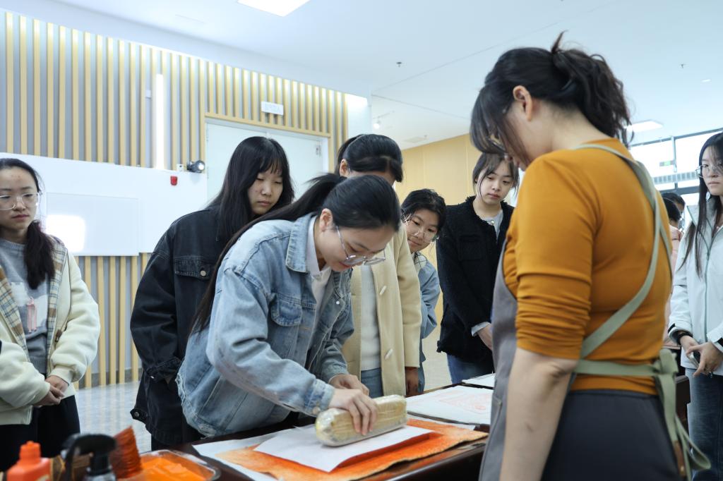 山东省图书馆(山东省古籍保护中心)还为同学们带来了丰富的体验活动。通过亲手刷印雕版、拓印石碑,观摩古籍修复,学生们近距离接触古籍,激发起古籍保护的兴趣与热情。