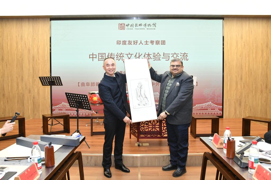 李兆祥对印度友人的来访表示热烈欢迎,他指出,中印同为四大文明古国,教育传统源远流长、薪火不息,曲阜师大植根孔子故里,始终以传承中华优秀文化、促进文明交流互鉴为己任,致力于搭建文明对话的桥梁纽带。他强调,中国教师博物馆作为全国唯一教师文化主题国家级博物馆,既是师德教育的重要基地,也是中外文明对话的重要平台。他希望通过此次访问,能够让印度友人深切感受中华尊师重道的文化内涵,进一步推动两国教育界的务实合作。
