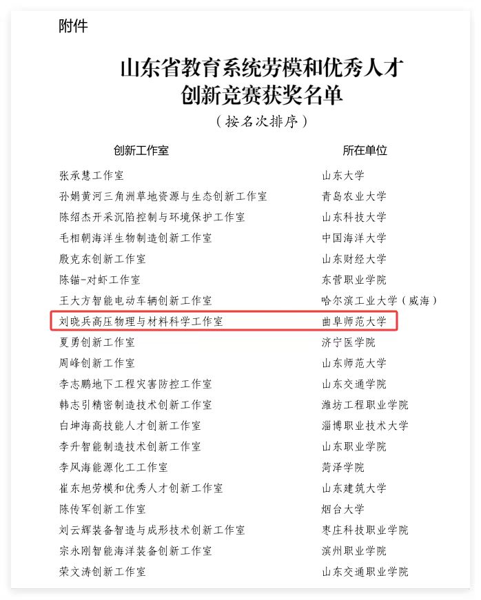 物理工程学院讯 近日,山东省教育工会委员会公布2025年“鲁新杯”山东省教育系统劳模和优秀人才创新竞赛获奖名单,曲阜师大推选的“刘晓兵高压物理与材料科学工作室”成功入选。
