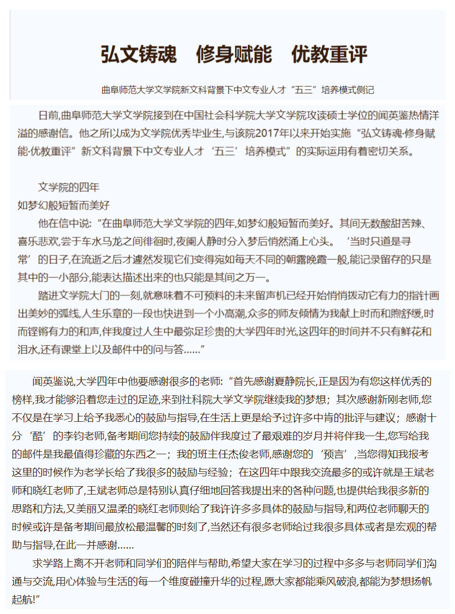 【齐鲁晚报】弘文铸魂 修身赋能 优教重评 ——亚搏集团官网(中国)官方网站文学院新文科背景下中文专业人才“五三”培养模式侧记