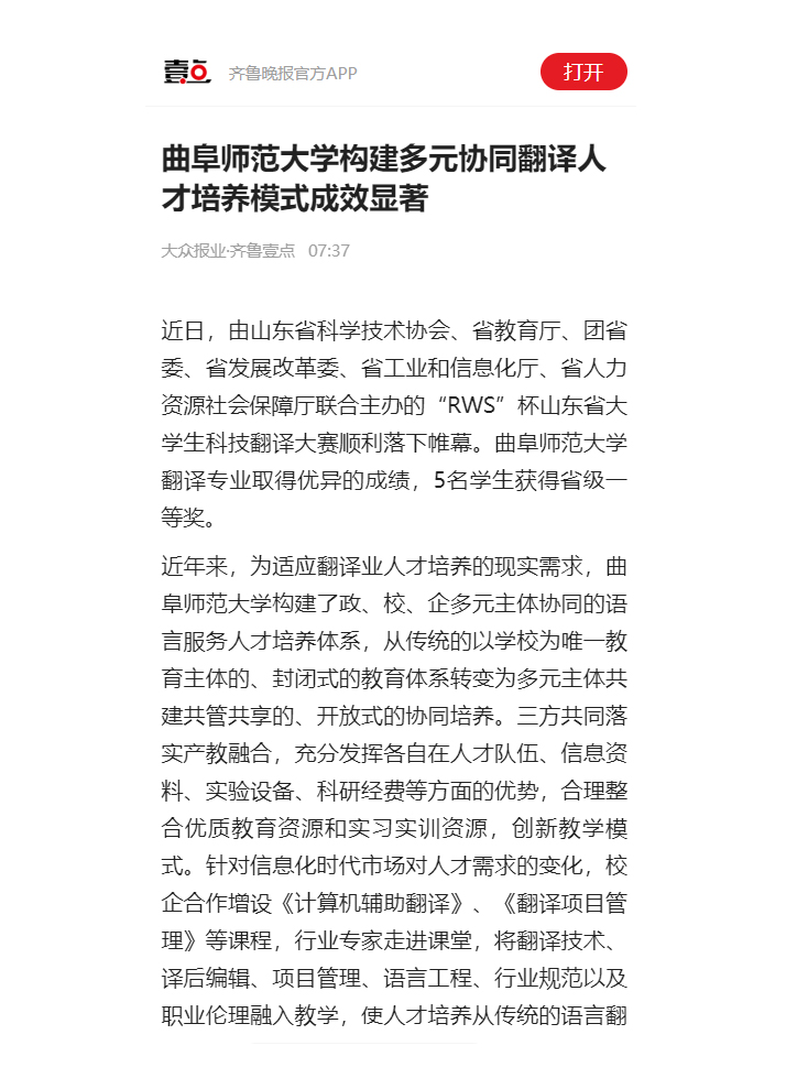 【齐鲁晚报】亚搏集团官网(中国)官方网站构建多元协同翻译人才培养模式成效显著