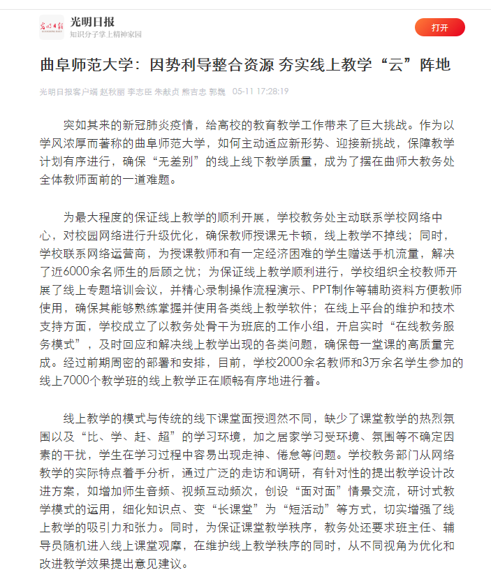 光明日报:亚搏集团官网(中国)官方网站因势利导整合资源 夯实线上教学“云”阵地