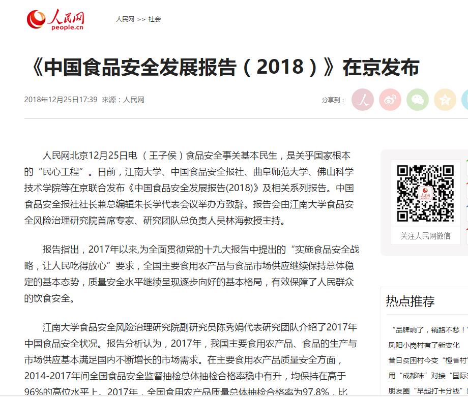人民网:《中国食品安全发展报告(2018)》在京发布