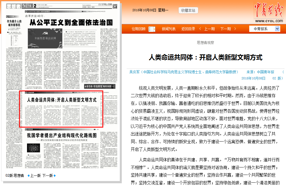 中国青年报刊发我校教师文章《人类命运共同体:开启人类新型文明方式》