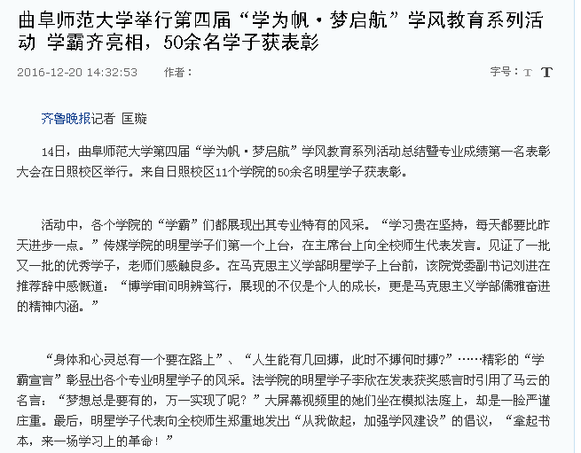 齐鲁晚报:亚搏集团官网(中国)官方网站举行第四届“学为帆·梦启航”学风教育系列活动 学霸齐亮相,50余名学子获表彰
