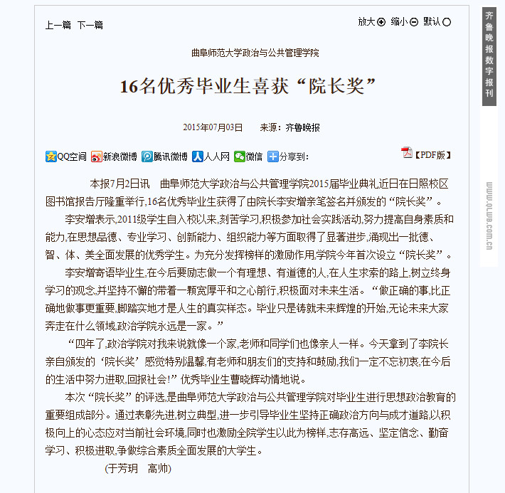 齐鲁晚报:亚搏集团官网(中国)官方网站政治与公共管理学院16名优秀毕业生喜获“院长奖”
