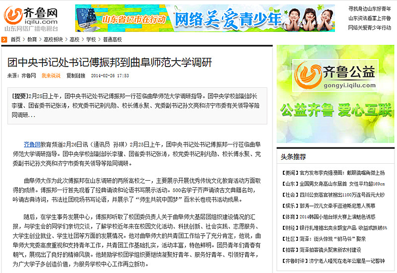 齐鲁网:团中央书记处书记傅振邦到亚搏集团官网(中国)官方网站调研