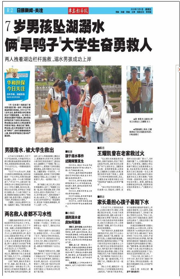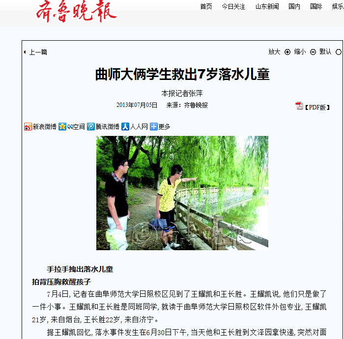 齐鲁晚报、半岛都市报:曲师大学子勇救落水儿童