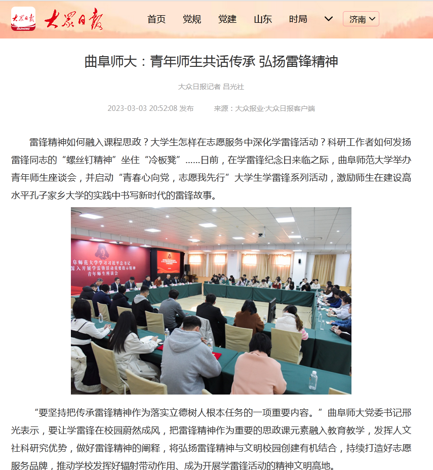 雷锋精神如何融入课程思政?大学生怎样在志愿服务中深化学雷锋活动?科研工作者如何发扬雷锋同志的“螺丝钉精神”坐住“冷板凳”……日前,在学雷锋纪念日来临之际,亚搏集团官网(中国)官方网站举办青年师生座谈会,并启动“青春心向党,志愿我先行”大学生学雷锋系列活动,激励师生在建设高水平孔子家乡大学的实践中书写新时代的雷锋故事。