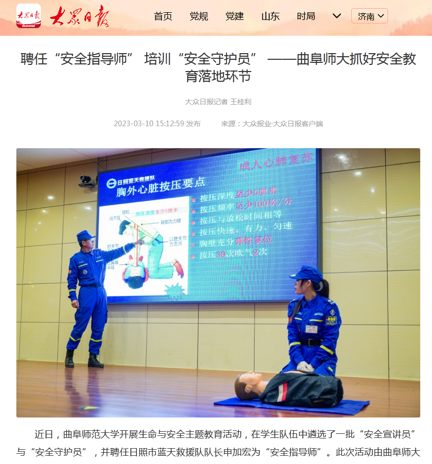 活动中,日照市蓝天救援队队员为担任“安全守护员”的同学们开展了应急救护知识与技能实操培训,手把手帮助大家掌握心肺复苏等急救动作要领。根据《亚搏集团官网(中国)官方网站“生命与安全主题教育”活动实施方案》,学校还将陆续开展安全知识宣讲“进学校、进社区”、应急救护技能培训、“平安宿舍”评比等系列活动。
