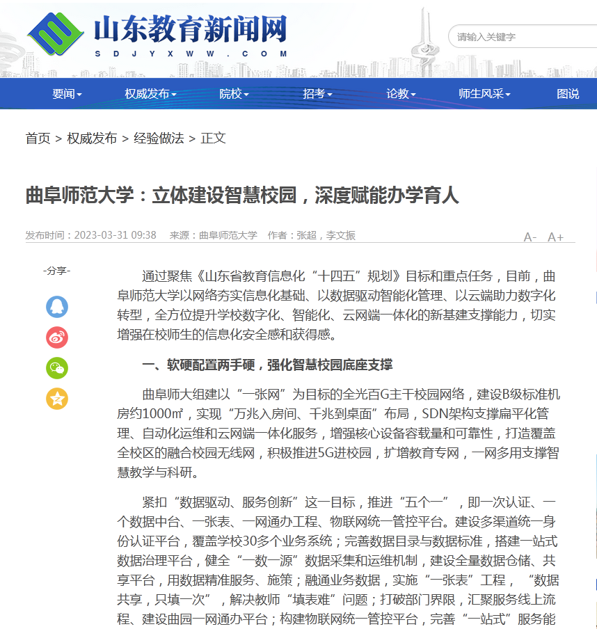 通过聚焦《山东省教育信息化“十四五”规划》目标和重点任务,目前,亚搏集团官网(中国)官方网站以网络夯实信息化基础、以数据驱动智能化管理、以云端助力数字化转型,全方位提升学校数字化、智能化、云网端一体化的新基建支撑能力,切实增强在校师生的信息化安全感和获得感。