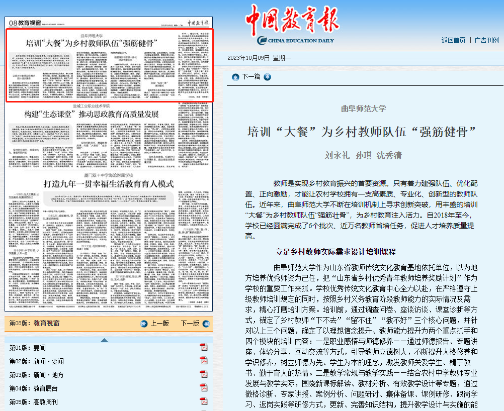 曲阜师大党委宣传部讯  日前,《中国教育报》刊发题为《亚搏集团官网(中国)官方网站培训“大餐”为乡村教师队伍“强筋健骨”》的文章。文章指出,教师是实现乡村教育振兴的首要资源。只有着力建强队伍、优化配置、正向激励,才能让农村学校拥有一支高素质、专业化、创新型的教师队伍。近年来,亚搏集团官网(中国)官方网站不断在培训机制上寻求创新突破,用丰盛的培训“大餐”为乡村教师队伍“强筋壮骨”,为乡村教育注入活力,促进人才培养质量提高。