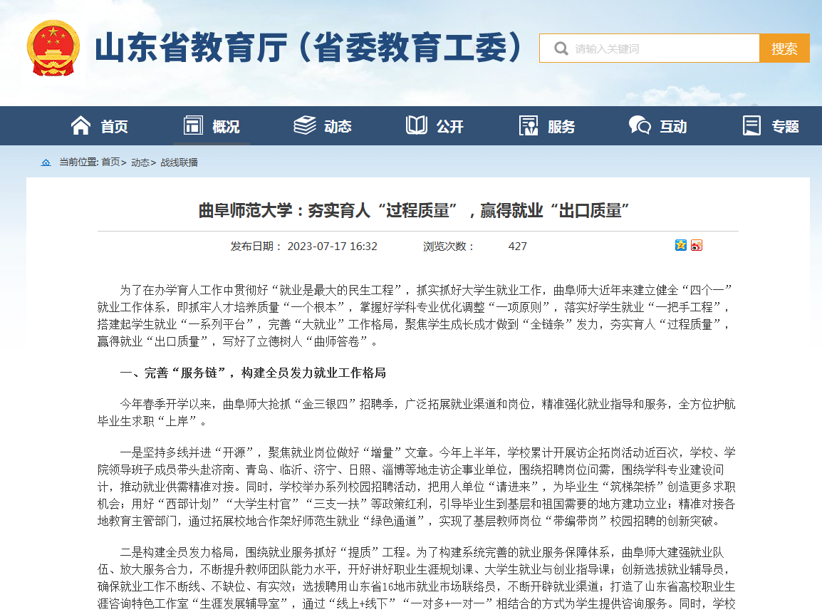 【山东省教育厅·战线联播】亚搏集团官网(中国)官方网站:夯实育人“过程质量”,赢得就业“出口质量”