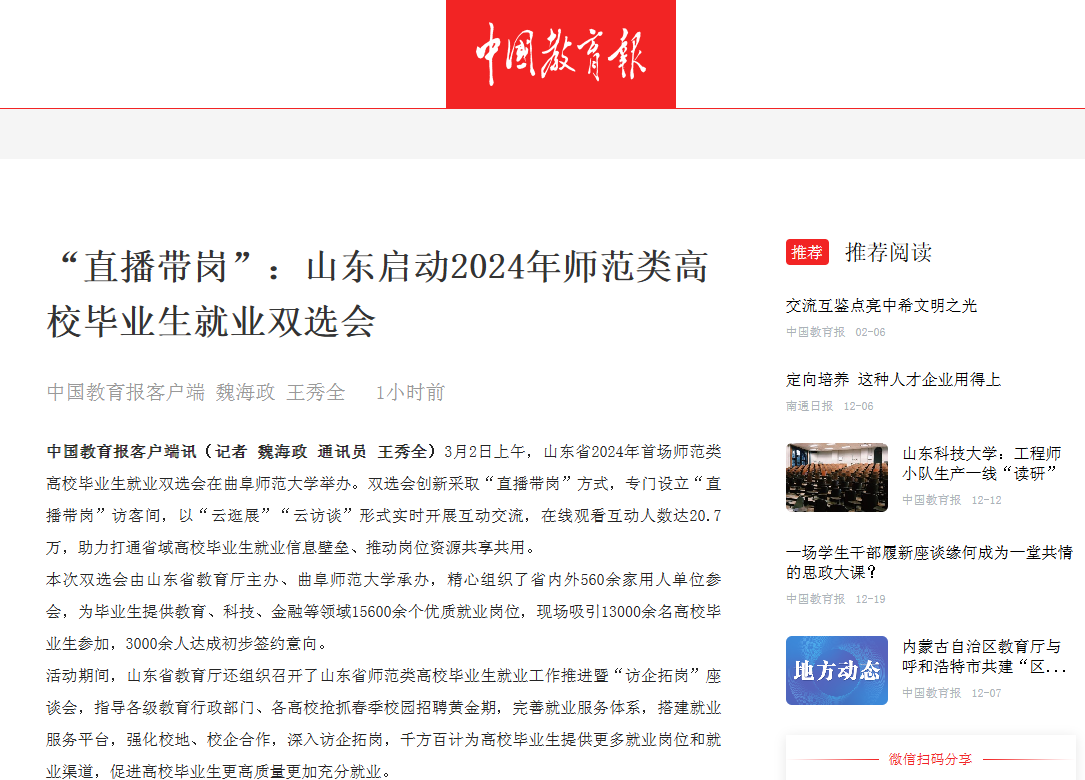 【中国教育报】山东启动2024年师范类高校毕业生就业双选会