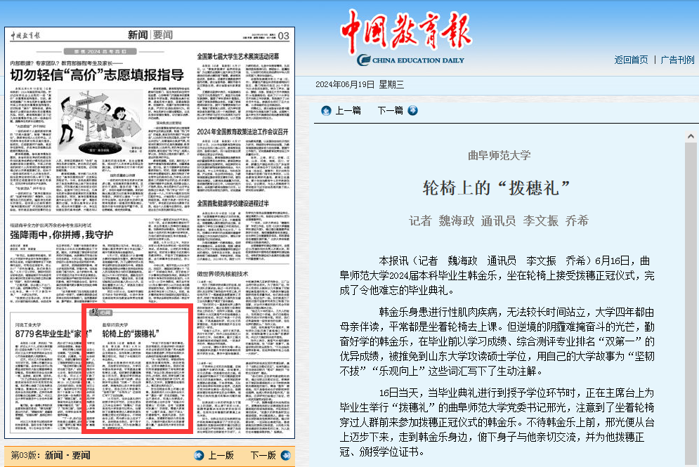 【中国教育报】亚搏集团官网(中国)官方网站:轮椅上的“拨穗礼”