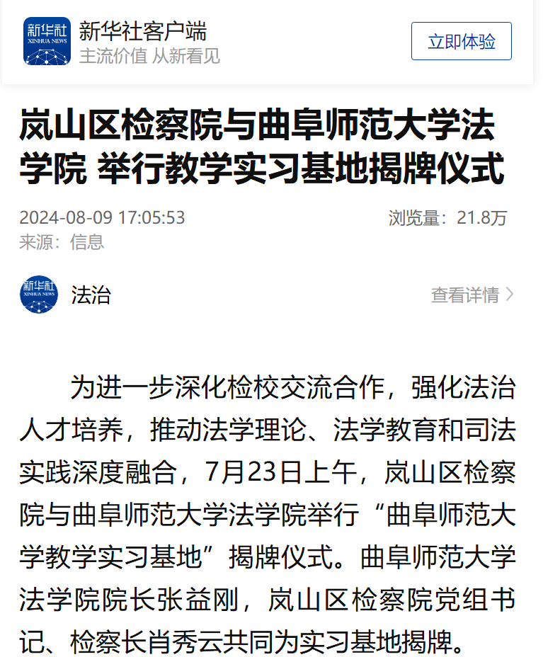 【新华社客户端】岚山区检察院与亚搏集团官网(中国)官方网站法学院举行教学实习基地揭牌仪式