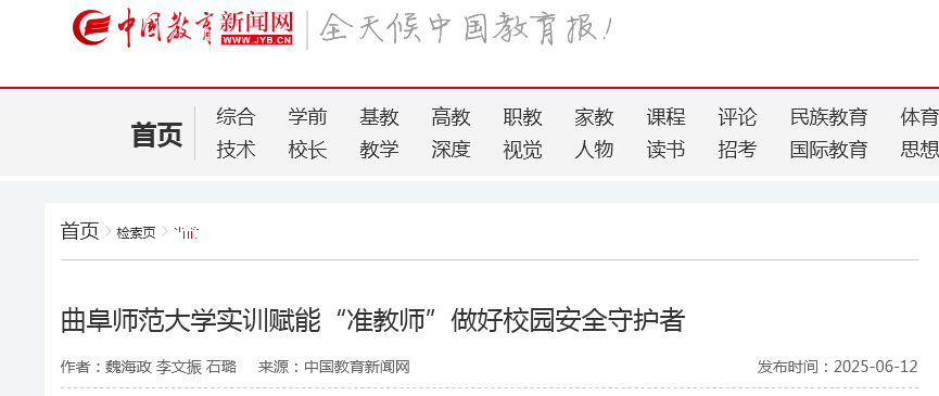 6月12日,中国教育新闻网以《亚搏集团官网(中国)官方网站实训赋能“准教师”做好校园安全守护者》为题,报道了学校联合济宁市消防救援支队、日照市消防救援支队,举办从教毕业生“消防安全明白人”固本强基培训班的创新实践。