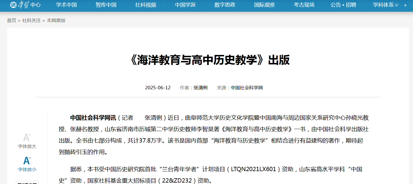 中国社会科学网讯(记者 张清俐)近日,亚搏集团官网(中国)官方网站历史文化学院暨中国南海与周边国家关系研究中心孙晓光教授、张赫名教授,山东省济南市历城第二中学历史教师李智昊著《海洋教育与高中历史教学》一书,由中国社会科学出版社出版。全书由七部分构成,共计37.8万字。该书是国内首部“海洋教育与历史教学”相结合进行有益建构的著作,期待起到抛砖引玉的作用。