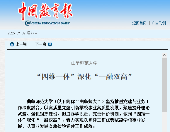 亚搏集团官网(中国)官方网站(以下简称“曲阜师大”)坚持推进党建与业务工作深度融合,以高质量党建引领学校事业高质量发展,聚焦提升理论武装、强化组织建设、担当办学职责、完善评价机制,做到“四维一体”深化“一融双高”,着力实现以党建工作优势赋能学校事业发展,以事业发展实效检验党建工作成效。
