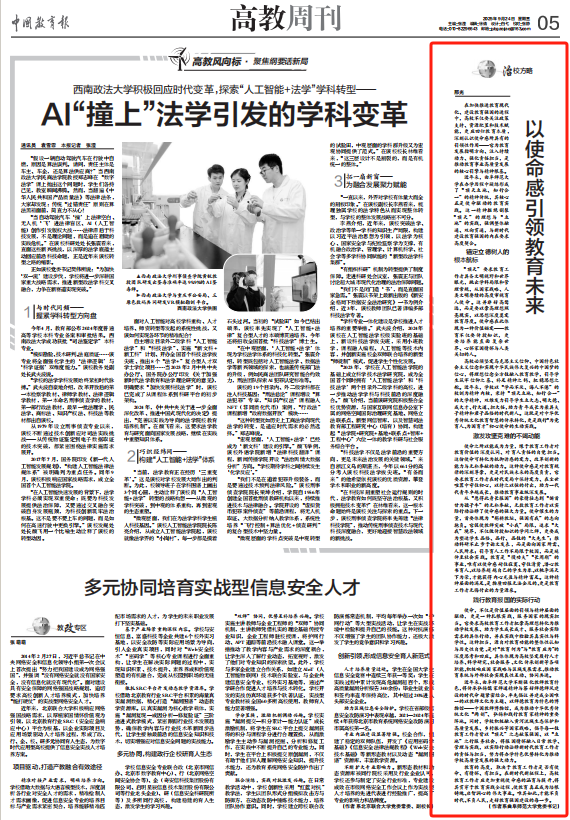 9月24日,《中国教育报》“治校方略”专栏刊发了亚搏集团官网(中国)官方网站党委书记邢光的署名文章《以使命感引领教育未来》。文章指出,亚搏集团官网(中国)官方网站在办学历程中凝练形成了“顶天立地、知行合一”的大学精神,引领全校上下锚定立德树人的根本航标、激发攻坚克难的不竭动能、践行教育报国的实际行动,其核心正是使命驱动的教育实践。