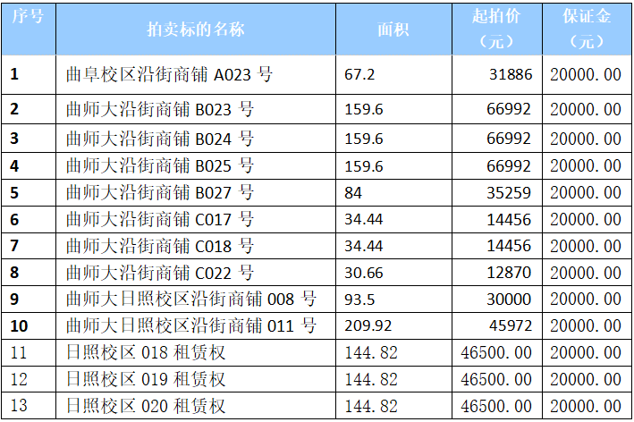 (paimai.caa123.org.cn)按现状公开拍卖以下标的:亚搏集团官网(中国)官方网站沿街房租赁权,门牌号为A023 \B023\B024\B025\B027\C017\ C018\C022 \日照校区008、011、018、019、020,共13套,每套竞买保证金2万元。