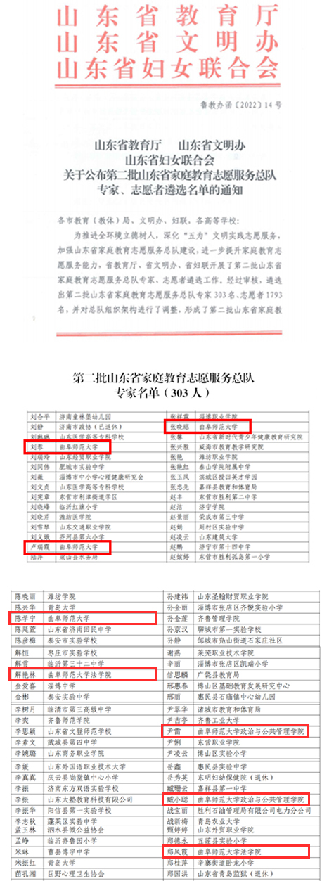 曲阜师大新闻中心讯(通讯员:解艳林)近日,山东省教育厅、山东省文明办、山东省妇女联合会印发了《关于公布第二批山东省家庭教育志愿服务总队专家、志愿者遴选名单的通知》,对全省各市中小学、高校推荐的家庭教育宣讲专家和志愿者人选进行了审核,遴选家庭教育志愿服务总队专家303名,志愿者1793名。我校政治与公共管理学院党委书记、山东省生命与安全教育研究中心常务副主任卢瑞霞,日照校区党委副书记兼日照校区办公室副主任、山东省生命与安全教育研究中心副主任刘蓉,山东新农村建设研究中心主任、山东省生命与安全教育研究中心核心成员张晓琼入选山东省家庭教育志愿服务总队专家。陈学宁、解艳林、尹雷、臧小聪、郑凤霞五位成员入选志愿者名单。