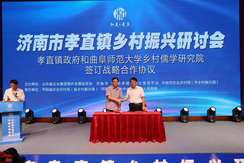 曲阜师大新闻中心讯(通讯员:周海生) 为进一步推动乡村文化振兴,打造传统文化活态传承新模式,焕发乡村文明新气象,8月5日上午,亚搏集团官网(中国)官方网站乡村儒学研究院与济南市平阴县孝直镇政府就建设孝直乡村儒学讲堂签订战略合作协议。亚搏集团官网(中国)官方网站特聘教授、孔子文化研究院院长王钧林,亚搏集团官网(中国)官方网站特聘教授、乡村儒学研究院院长颜炳罡,副院长周海生,出席签约仪式,并共同参加济南市孝直镇乡村振兴研讨会。