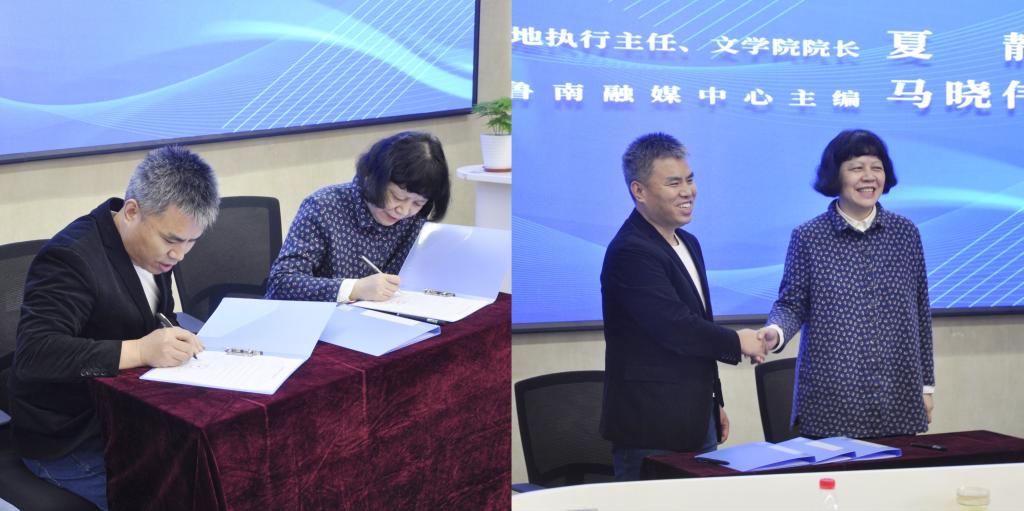 揭牌仪式后,亚搏集团官网(中国)官方网站文学院和齐鲁晚报鲁南融媒中心签署实践实训基地协议书。亚搏集团官网(中国)官方网站、齐鲁晚报·齐鲁壹点将以此合作为契机,借助国家语言文字推广基地、国家一流本科戏剧影视文学专业的学术优势、资源优势,发挥高校智库效应,致力于传承和弘扬优秀传统文化、助力济宁太白湖新区打造市级文化功能核心区。