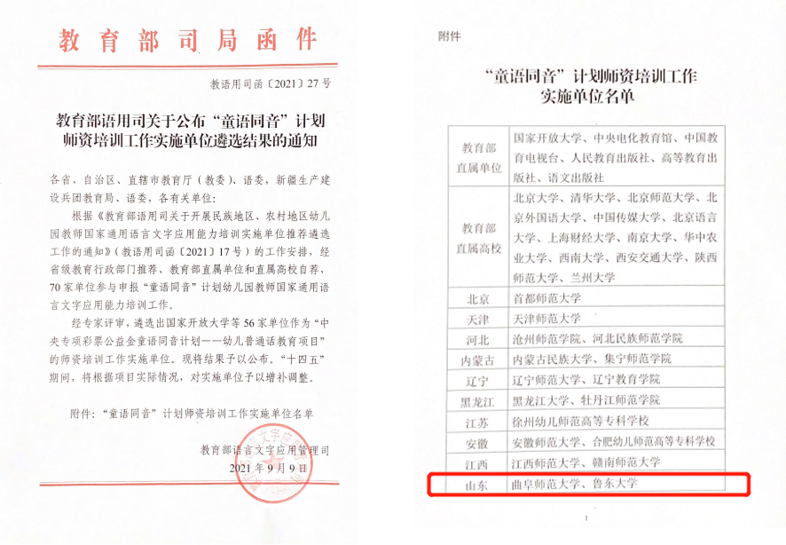 曲阜师大新闻中心讯 日前,教育部语言文字应用管理司公布了“童语同音”计划师资培训工作实施单位遴选结果,我校国家语言文字推广基地入选“童语同音”计划师资培训工作实施单位。山东省入选的单位有亚搏集团官网(中国)官方网站、鲁东大学。