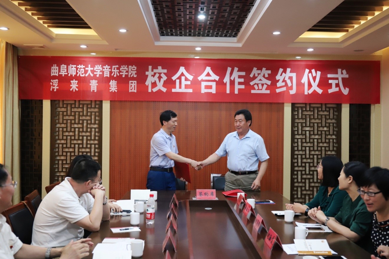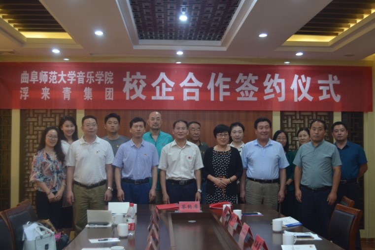 为更好地实现人才培养目标,给学生营造一个良好的实习环境,进一步加强实践性教学环节,培养学生实际动手能力, 7月3日上午,我校音乐学院与浮来青集团校企合作签约仪式顺利举行,音乐学院教学实习基地落户浮来青集团。出席此次仪式的嘉宾有:莒县人民政府副县长纪淑霞,莒县文化和旅游局局长高树华,莒县文化和旅游局副局长王亚蕾,莒县文化和旅游局党组成员赵雅楠;夏庄镇党委宣传委员刘喜梅,莒县文化馆馆长马树晓,浮来青集团董事长卢宝春;音乐学院党委书记胡长春,音乐学院院长肖桂彬等。仪式由高树华主持。