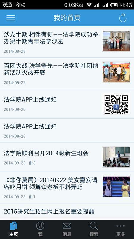 近期,法学院自主开发了学院官方手机APP软件并进行上线公测。法学院开发官方手机APP软件的目的在于使学生通过手机客户端便可及时了解学院工作动态,促进学院与学生的沟通与联系,实现信息的交流和共享。作为新媒体,法学院官方APP拓展了学院宣传的渠道,面向法学院全体师生,集查询、阅读、交流、分享等功能于一身,为法学院广大师生提供了一个交流学习的平台。